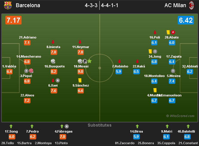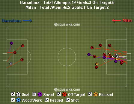Hampir sepanjang laga, Milan terkurung di wilayah sendiri. Dominasi Barcelona melalui tiga gelandangnya plus performa bagus Neymar (5 dribel sukses, 3 shot, 1 key pass) dan Messi (5 dribel sukses, 3 shot, 2 gol, 3 key pass) pun menjadi faktor krusial dalam kemenangan sang raksasa Catalan.