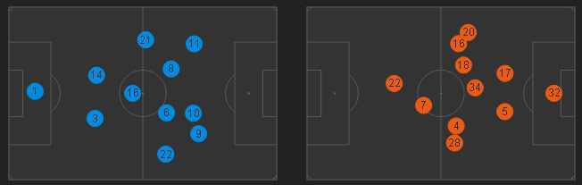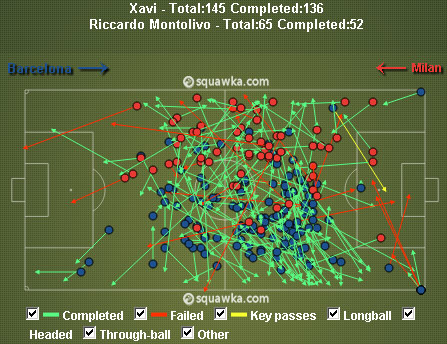 Kaka dan Robinho disisakan di lini depan untuk menunggu peluang datang. Hanya saja, para gelandang Milan kalah dalam pertarungan memperebutkan ball possession. merajalela dengan jumlah operan terbanyak (145) plus satu assist. Angka 145 itu bahkan dua kali lipat lebih dari operan terbanyak yang ditorehkan Milan atas nama Montolivo.