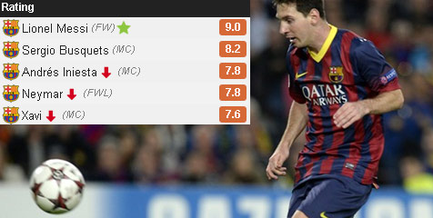 Pasukan Gerardo Martino mendominasi total permainan di Camp Nou, Kamis (07/11). Setengah jam usai kick-off, Barcelona langsung unggul lewat eksekusi penalti Messi setelah sebelumnya Ignazio Abate dianggap melanggar Neymar yang sedang memburu clip pass Andres Iniesta di area terlarang. Sembilan menit berselang, pelanggaran kapten Milan Ricardo Montolivo terhadap Neymar di sektor kanan pertahanan timnya membuat Xavi bisa mengirim free kick yang dituntaskan Sergio Busquets dengan sundulan untuk skor 2-0. Sebelum jeda, melewati Dani Alves, melepas crossing yang dibelokkan Gerard Pique ke gawang Victor Valdes dan selisih skor pun menipis.