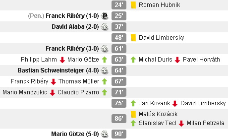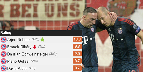 Gol pertama Bayern tercipta lewat penalti Ribery setelah sebelumnya Robben dilanggar Roman Hubnik di area terlarang. Sementara itu, gol Alaba (2-0) merupakan hasil assist Mandzukic, gol kedua Ribery (3-0) dari assist Robben, gol Schweinsteiger (4-0) diawali assist Gotze. Robben, yang mengincar rekor mencetak gol dalam enam partai beruntun Liga Champions, gagal mencatatkan namanya di papan skor. Namun, sang winger Belanda sudah memberi teror tanpa henti bagi tim tamu dan menutup laga ini dengan assist keduanya untuk gol pemungkas Bayern oleh Gotze.