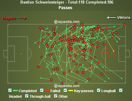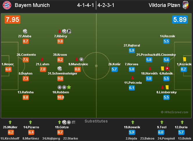 Dengan possession yang mencapai 77% hasil komando Schweinsteiger di lini tengah dan gempuran tanpa henti lewat serta Ribery dari kedua sayap, Bayern mengurung dan memaksa Plzen hanya fokus untuk bertahan.