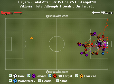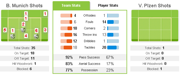 Bayern tak hanya mendominasi ball possession, tapi juga menghujani gawang Plzen dengan tembakan. Totalnya, 35 tembakan! Dari 35 shot tersebut, 18 di antaranya on target, tapi hanya 5 yang bersarang di gawang. Semua itu tak lepas dari permainan impresif Kozacik di bawah mistar. Kiper 29 tahun asal Slovakia itu tampil brilian dengan menggagalkan 13 shot on target Bayern melalui Toni Kroos (3), Alaba (2), Schweinsteiger (2), Claudio Pizarro (2), Robben (2), Daniel van Buyten dan Mario Mandzukic.