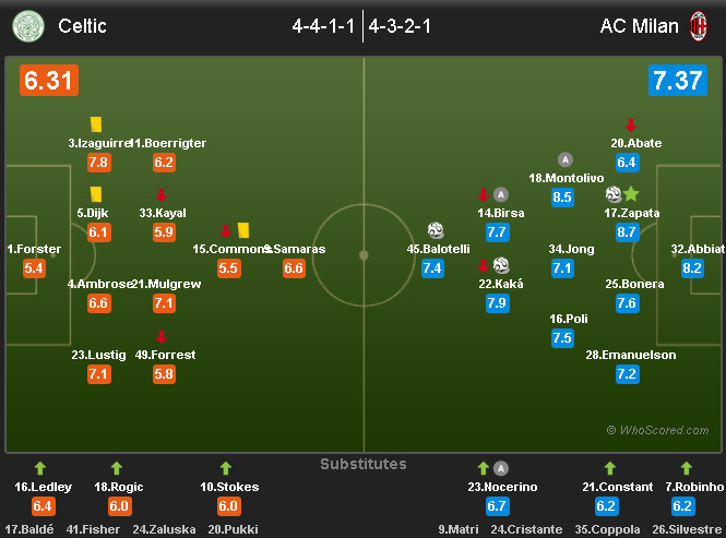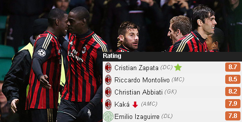 Pasukan Massimiliano Allgeri berjaya di Celtic Park, Rabu (27/11). Baru 12 menit laga berjalan, Kaka membawa Milan unggul dengan golnya memanfaatkan corner Valter Birsa. Pada menit 49, lagi-lagi diawali corner Birsa, pemain pengganti Antonio Nocerino mengirim assist untuk gol kedua Milan oleh bek Cristian Zapata. Kemenangan Milan ditegaskan oleh finishing Mario Balotelli memanfaatkan assist Riccardo Montolivo di menit 59.