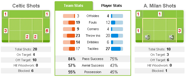 Celtic pantas menyesali hasil ini. Unggul penguasaan bola hingga 55% dan melepas tembakan dua kali lipat lebih banyak daripada Milan, Celtic justru menyerah tiga gol tanpa balas.