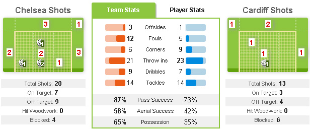 Sementara itu, Cardiff pantas menyesali kekalahan ini. Pasalnya, anak-anak asuh Malky Mackay bukannya tanpa perlawanan sama sekali. Total 13 shot, 3 on target, mereka ciptakan lewat serangan yang dibangun sebagian besar dari sayap. Hanya saja, pertahanan Chelsea yang dikomandani John Terry tidak mudah diruntuhkan, khususnya setelah kecolongan gol pertama.