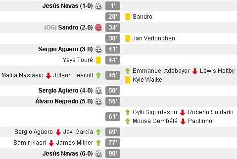 Pasukan Andre Villas-Boas benar-benar dibuat tak berkutik di Etihad Stadium, Minggu (24/11). Navas membuka skor hanya dalam hitungan detik sejak kick-off. Setelah itu, own goal Sandro Raniere dan finishing jarak dekat Sergio Aguero membawa City unggul 3-0 hingga jeda. Usai restart, Aguero mencetak gol keduanya memanfaatkan assist Yaya Toure sebelum Alvaro Negredo menjadikan selisih skor semakin melebar. Pada masa injury time, Navas melengkapi brace-nya dan memastikan Spurs menyerah enam gol tanpa balas.