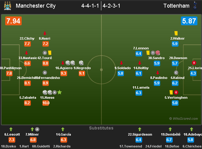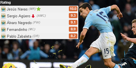 Keputusan Pellegrini memainkan Navas sejak menit awal terbukti sangat tepat. Winger Spanyol itu menjadi pemain dengan rating tertinggi dalam laga ini berkat 2 tackle, 1 interception, 2 crossing akurat, 4 key pass, assist untuk gol pertama Aguero, 3 shot, 2 shot on target dan sepasang golnya.