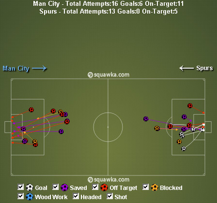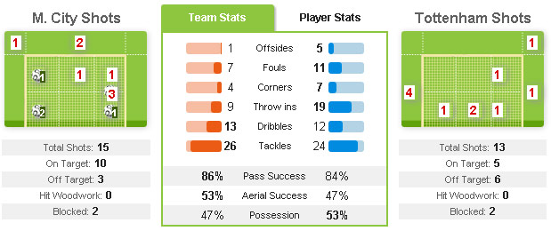 Enam gol didapat City dengan 10 shot on target dari total 15 shot-nya, sedangkan Tottenham tak sekali pun menjebol gawang Costel Pantilimon dengan 5 shot on target dari 10 shot yang mereka hasilkan.