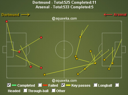 Kalau melihat jumlah peluang, Dortmund seharusnya bisa menang. Hanya saja, serangan Dortmund tidak maksimal karena left attack mereka terbentur ketangguhan bek kanan Bacary Sagna serta dinding pertahanan Arsenal yang digalang Per Mertesacker (2 tackle, 4 interception, 8 clearance) dan penampilan impresif Szczesny di bawah mistar.