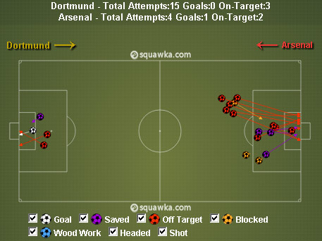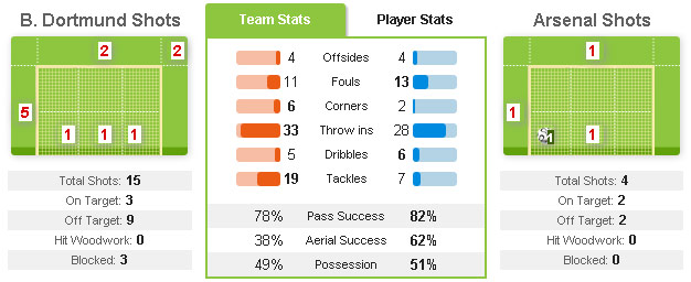 Arsenal, yang cukup tertekan menghadapi gempuran Dortmund, hanya sanggup menghasilkan total empat tembakan. Dari empat peluang yang dirancang oleh Giroud (2), Santi Cazorla serta Ozil itu, Arsenal mendapat dua shot on target melalui Ramsey dan salah satunya bersarang di gawang. Di sini, efektivitas serangan Arsenal terlihat.