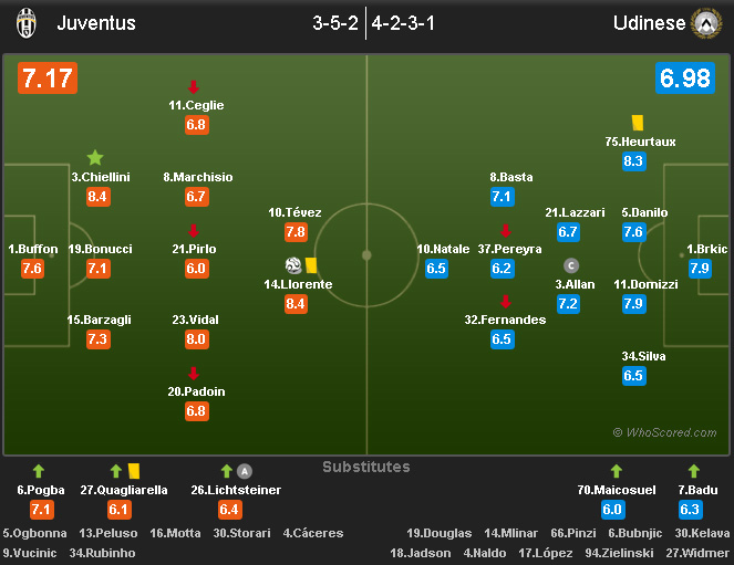 Juventus, yang hampir sepanjang laga tak henti menekan, khususnya lewat Carlos Tevez (key pass terbanyak 7, shot terbanyak 8, 3 dribel sukses), dibuat cukup frustrasi oleh Udinese.