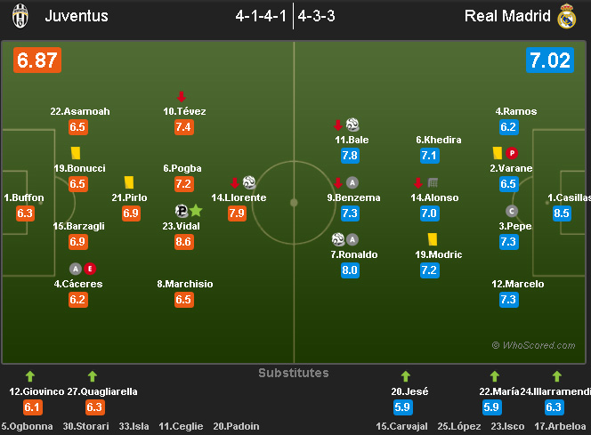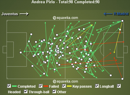 Trio Alonso, Luka Modric dan Sami Khedira bertarung ketat dengan empat gelandang Juventus yang berdiri di depan Pirlo, sang regista. Dengan kombinasi operan-operannya, Madrid bisa memenangi penguasaan bola. Namun, memanfaatkan jangkauan passing Pirlo, Juventus bermain lebih direct dan sanggup menciptakan lebih banyak ancaman, terutama lewat serangan frontal dari tengah.