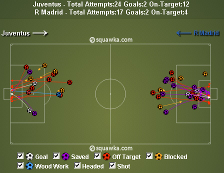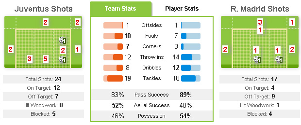 Sementara itu, Juventus melalui serangan langsungnya berulang kali menghujani gawang Madrid dengan tembakan. Total 24 shot (12 on target) dilepas oleh Juventus dalam laga ini. Namun, hanya dua yang lepas dari penjagaan Casillas. Sepuluh lainnya lewat Vidal (3), Llorente (2), Marchisio (2), Fabio Quagliarella (2) dan Carlos Tevez mentah di tangan kiper nomor satu Spanyol tersebut.