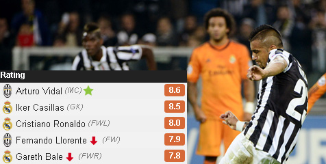 Pasukan Antonio Conte sangat membutuhkan kemenangan di Juventus Stadium, Rabu (06/11), demi menjaga asa lolos ke babak 16 besar. Jalan terbuka ketika Arturo Vidal memecah kebuntuan melalui eksekusi penalti pada menit 42 setelah Paul Pogba dilanggar Raphael Varane di area terlarang. Madrid menyamakan kedudukan di babak kedua memanfaatkan keteledoran Martin Caceres, yang membuat Karim Benzema bisa mengirim assist untuk Cristiano Ronaldo (52'). Delapan menit berselang, setelah sebelumnya sepakan Xabi Alonso menerpa mistar dan peluang Cladio Marchisio disapu Pepe di garis gawang, skuat Carlo Ancelotti berbalik unggul berkat assist Ronaldo untuk gol kedua Madrid lewat finishing Gareth Bale. Keadaan itu hanya bertahan lima menit. Caceres membayar kesalahannya dan melepas crossing yang dituntaskan Fernando Llorente guna mencetak gol kedua tuan rumah, gol terakhir dalam laga di Turin.