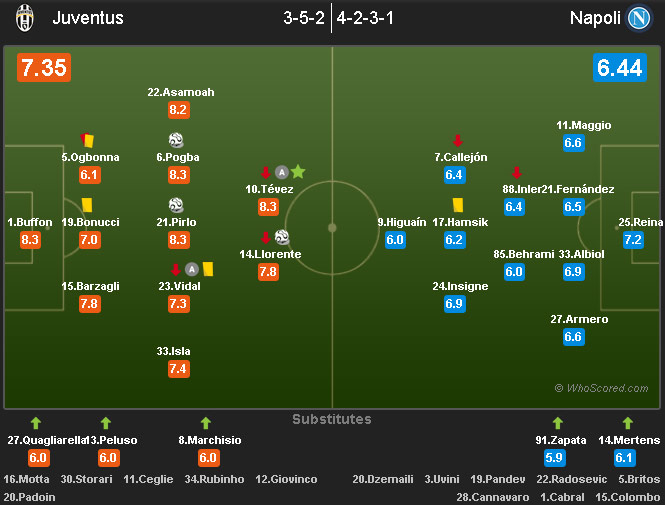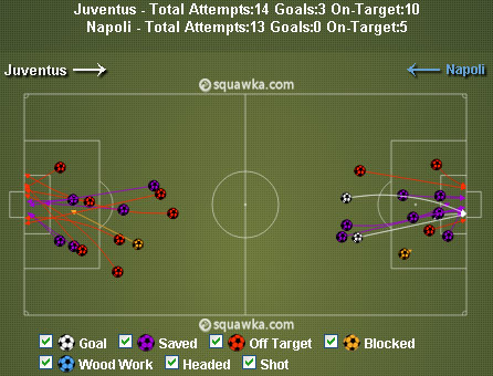 Napoli sendiri bukan tanpa perlawanan. Melalui trisula gelandang serang Jose Callejon, Marek Hamsik dan Lorenzo Insigne yang berdiri di belakang Gonzalo Higuain, Napoli beberapa kali mencoba mencetak angka. Tiga bek sentral Juventus dibuat cukup kewalahan. Napoli bahkan bisa mendapatkan lima shot on target dari semua peluangnya.