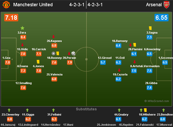 Patrice Evra (6 tackle, 2 interception, 1 clearance), van Persie (1 shot, 1 on target, 1 gol), Phil Jones (3 dribel sukses, 2 interception, 7 clearance), Rooney (3 dribel sukses, 3 shot, 1 on target, 1 key pass, 1 assist) dan Chris Smalling (6 tackle, 3 interception, 8 clearance) adalah lima pemain dengan kontribusi paling besar dalam kemenangan United ini.
