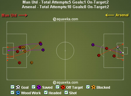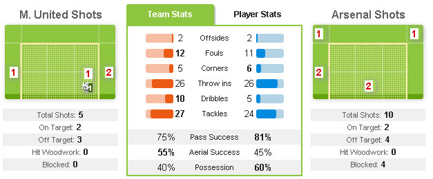 Di laga ini, Arsenal dibuat jadi pihak yang terpaksa keluar menyerang guna mencari gol balasan. Hanya saja, meski unggul ball possession, para gelandang Arsenal seolah dibuat mati kutu. Serangan mereka, terutama lewat Bacary Sagna di sektor kanan, terbentur sederet interception United. Tuan rumah menangkal nyaris semua potensi ancaman Arsenal sebelum mencapai wilayah rawan.