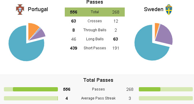 Pepe (9 clearance) dan Bruno Alves (8 clearance) bermain solid di jantung pertahanan untuk meminimalkan potensi ancaman dari Ibrahimovic. Sementara itu, gelandang serang AS Monaco Joao Moutinho dan Veloso (Dynamo Kiev) tampil gemilang di lini tengah. Moutinho membukukan key pass terbanyak (4) dan paling sering melepas umpan silang (20), sedangkan Veloso aktif membantu serangan maupun pertahananan. Ronaldo, meski beberapa kali terbentur penjagaan Sebastian Larsson dan Mikael Lustig, tetap mampu menunjukkan keistimewaannya sebagai pencipta perbedaan.