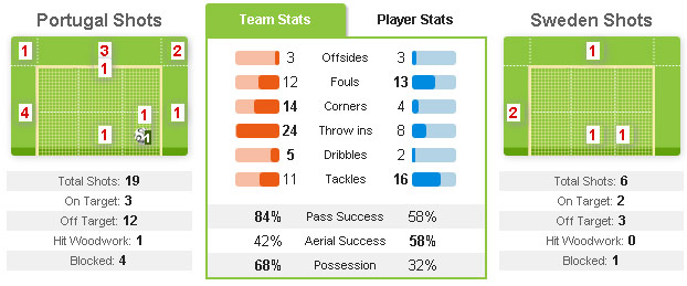 Portugal bermain jauh lebih baik setelah jeda dan menekan Swedia habis-habisan. Dengan operan-operan pendek, sejumlah through pass dan bombardir crossing dari sayap, yang dipadu kreativitas para gelandangnya, Portugal sampai menghasilkan shot tiga kali lipat lebih banyak daripada Swedia.