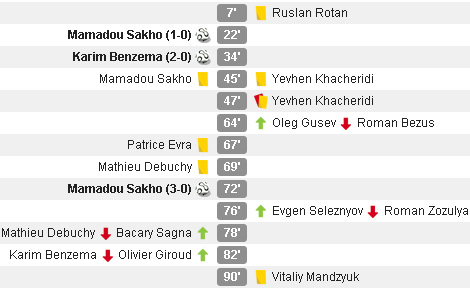 Pelatih Ukraina Mykhaylo Fomenko tetap setia menggunakan formasi 4-2-3-1, tapi minus Olexandr Kucher (kartu merah) dan Artem Fedetskiy (akumulasi kartu). Sementara itu, Deschamps beralih dari 4-2-3-1 ke 4-3-3 dengan perombakan besar-besaran pada starting lineup-nya.