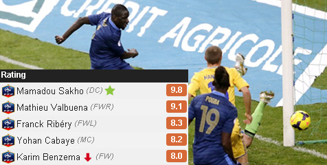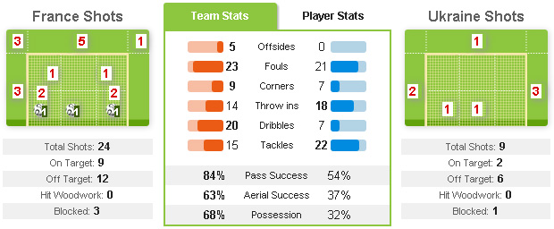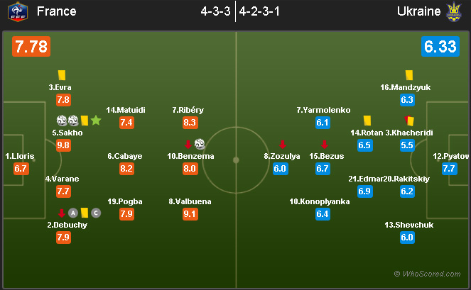 Sakho tak hanya tangguh dalam mengawal pertahanan, tapi juga berperan besar mencetak gol pertama dan ketiga Prancis memanfaatkan situasi set-piece serta meneruskan assist Debuchy. Sementara itu, Valbuena membuat serangan sayap Prancis tak cuma terfokus pada Ribery di kiri. Gelandang Marseille itu memberi ancaman lebih besar bagi Ukraina di sisi kanan dengan 5 dribel sukses, 6 key pass dan 2 shot on target-nya.