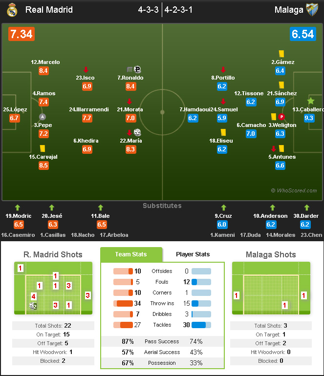 Namun, cuma dua gol yang didapat Madrid. Pasalnya, 13 shot on target mereka lewat Ronaldo (6), Alvaro Morata (3), Di Maria, , dan kandas oleh aksi-aksi penyelematan Caballero di bawah mistar Malaga. Kalau boleh dibilang, laga ini 90 persen merupakan pameran kekuatan ofensif Madrid, sedangkan 10 persen sisanya jadi ajang Caballero unjuk kebolehan, tapi 90 persen itu sudah cukup bagi Madrid untuk mengamankan tiga angka.