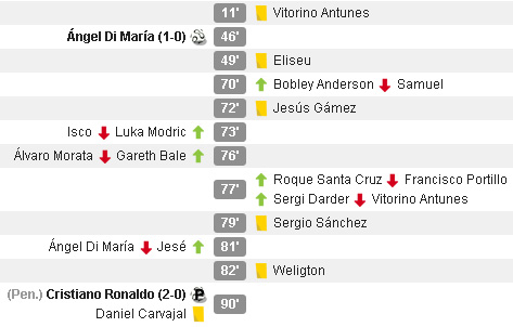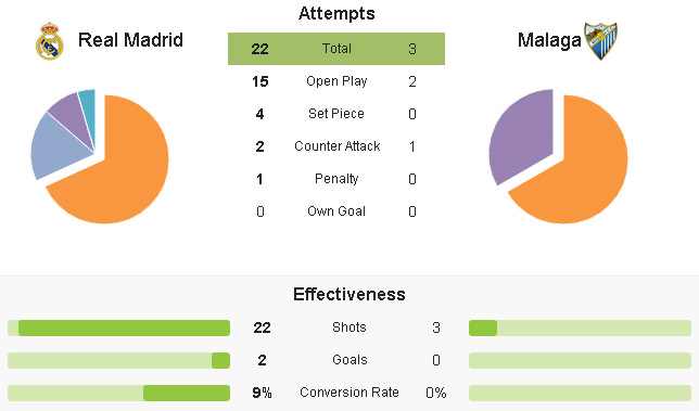Secara keseluruhan, permainan Madrid nyaris sempurna, baik dalam mode defensif maupun saat menyerang, khususnya dari sektor kanan. Total 22 tembakan mereka hasilkan lewat open play, set piece serta counter attack. Sementara itu, Malaga hanya sekali menciptakan ancaman berarti bagi Diego Lopez, yaitu melalui bek kanan Jesus Gamez.