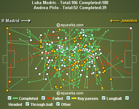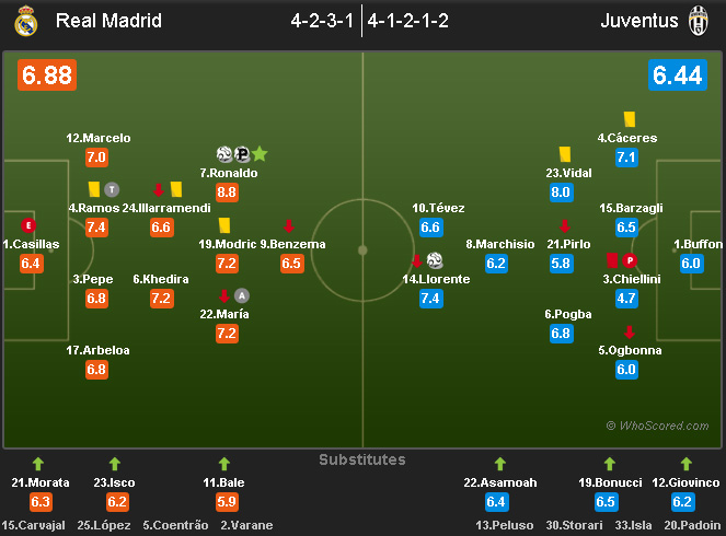 Terpecahnya fokus Vidal serta Pogba menyebabkan Pirlo kehilangan backup dan gerakannya pun terkunci oleh Asier Illarramendi serta Sami Khedira. Luka Modric jadi leluasa menjalankan perannya sebagai pembagi bola. Ini membuat serangan Juventus agak macet, terutama setelah Llorente ditarik keluar dan Conte memasukkan Leonardo Bonucci untuk menambal lubang yang ditinggalkan Chiellini.