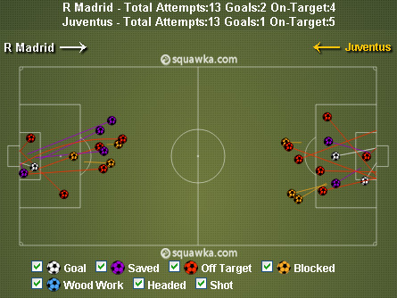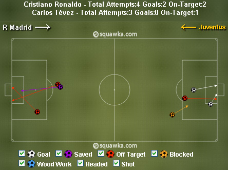 Hasilnya lumayan efektif. Sepanjang laga, Ronaldo hanya diizinkan melepas 4 tembakan (2 on target), terbanyak dibandingkan para pemain Madrid lainnya. Sementara itu, di kubu Juventus, Carlos Tevez dan pemain pengganti Sebastian Giovinco memimpin dengan masing-masing 3 serta 1 on target.