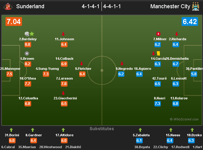 Di 20 menit awal, ball possession terbagi rata. Sunderland lah yang mendapatkan gol pertama. Memanfaatkan miskomunikasi James Milner dan Martin Demichelis, operan panjang Brown mendarat mulus di jalur lari Bardsley, yang kemudian menaklukkan Costel Pantilimon di bawah mistar dengan finishing tenangnya.