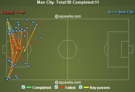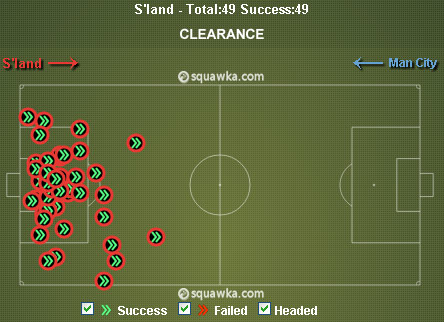 Bardsley, Brown dan John O'Shea tampil solid dalam menggalang pertahanan Sunderland. Sulit masuk ke kotak penalti, sebagian besar tembakan City pun dilepas dari luar area. Di sinilah City dibuat frustasi. Total 24 shot mereka bukukan, tapi cuma empat atas nama Sergio Aguero, Milner, Micah Richards dan substitute Edin Dzeko yang mengarah ke gawang. Empat shot on target itu semuanya dimentahkan oleh Vito Mannone.