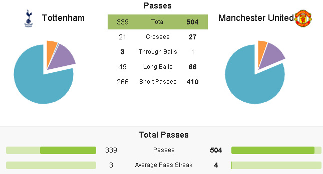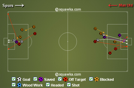 Secara keseluruhan, United mendominasi ball possession dengan kombinasi short pass, long ball dan crossing-nya. Namun, Spurs lebih sering sering mengancam gawang David de Gea. Hanya saja, dari 10 shot (United 8), yang tepat sasaran cuma 4 (United 3). Sial bagi Spurs, United mencetak jumlah gol yang sama dengan yang mereka dapatkan.