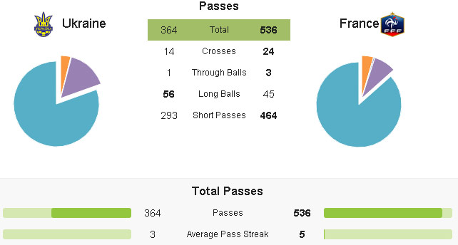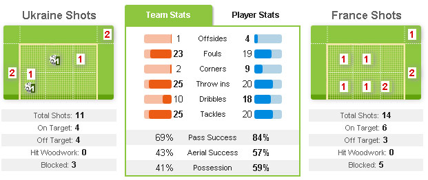 Kedua tim sama-sama bermain memakai formasi 4-2-3-1, tapi pendekatannya sedikit berbeda. Saat Prancis menyerang lebih gencar, terutama lewat Ribery di sektor kiri, Ukraina lebih sering fokus bertahan sambil mengincar celah untuk melakukan serangan balik dengan bola-bola panjang dan kecepatan para pemain depannya.