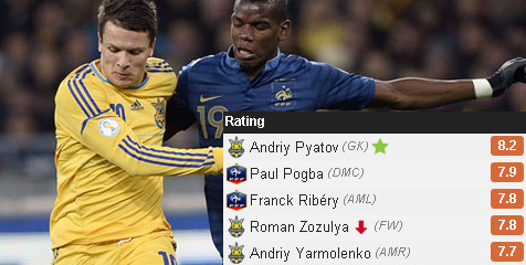 Ribery terkunci, Pogba melejit. Pogba melakukan tugasnya dengan baik sebagai pemutus serangan Ukraina. Total 3 tackle, 5 interception dan 4 clearance ditorehkannya sambil sesekali coba membantu serangan. Namun, meski ditunjang penampilan apik bek kiri Manchester United Patrice Evra maupun gelandang Manchester City Samir Nasri, itu semua tak cukup bagi Prancis untuk meraih kemenangan.