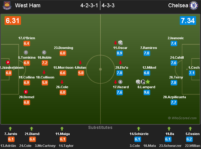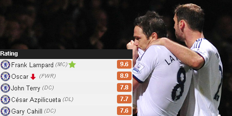 Lampard sendiri layak dinobatkan sebagai man of the match dengan 7 shot (4 on target), 4 key pass dan sepasang golnya. Selain itu, pujian pun pantas diberikan kepada Oscar, yang work rate-nya sungguh luar biasa. Gelandang serang Brasil itu tak hanya menyumbang satu gol, tapi juga menciptakan tiga peluang (key pass) dan menorehkan 7 tekel sukses. Angka 7 itu adalah yang terbanyak di laga ini, padahal dia merupakan seorang penyerang. Cesar Azpilicueta (1 key pass, 2 tackle, 6 clearance) melengkapi top 5 players dari laga di Upton Park.