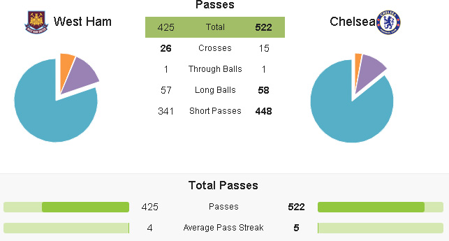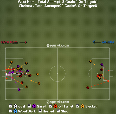 Penguasaan bola sebenarnya tidak terlalu jauh berbeda. Namun, Chelsea sukses membuat kreativitas West Ham tumpul. Sepanjang laga, West Ham bahkan cuma diizinkan sekali melepas tembakan tepat sasaran melalui Joey O'Brien. Itu pun mentah oleh Petr Cech di bawah mistar. Chelsea sebaliknya. Dari total 20 shot, 8 di antaranya on target dan 3 bersarang di gawang lawan.