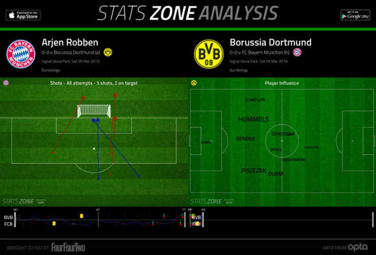 Marcel Schmelzer yang kaya pengalaman dengan rajin memberi pressure kepada Robben dan menggiringnya hingga masuk radius penjagaan Mats Hummels. Dengan bantuan Ilkay Gundogan dan Marco Reus yang mundur ke belakang, Dortmund sanggup membatasi Robben hingga cuma mendapatkan dua shots on target sepanjang laga.