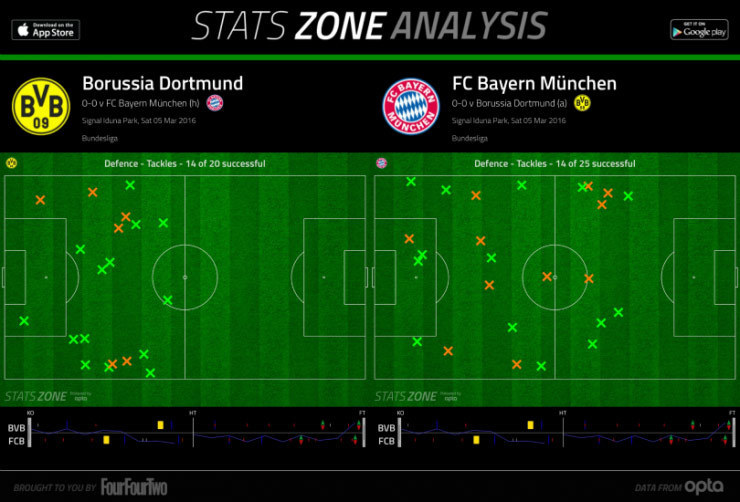 Itu terlihat dari Dortmund yang tak sekali pun melancarkan tekel di wilayah Bayern. Beda dengan Bayern yang melakukan pressing tinggi dan berulang kali memenangkan perebutan bola di wilayah lawan sesuai instruksi Josep Guardiola.