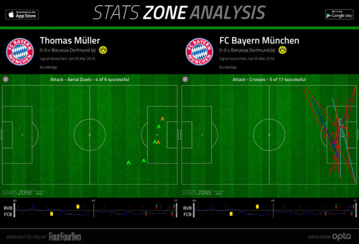 Melawan Borussia Dortmund, Muller memenangi dua duel udara di dalam kotak penalti. Namun itu tidak terlalu berarti. Berkat kemampuan mumpuni dua bek sayap Marcel Schmelzer dan Lukasz Piszczek dalam one-on-one defending, kualitas crossing Bayern ke jantung pertahanan Dortmund pun tereduksi.