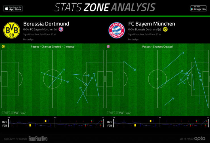 Dari grafik di bawah, kita bisa lihat bagaimana peluang-peluang Bayern tercipta. Peluang-peluang itu kebanyakan didapat di luar kotak Die Borussen, yang kemudian diteruskan dengan tembakan jarak jauh.