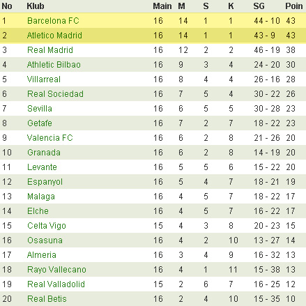 Saat ini, Barcelona memimpin dengan 43 poin dan goal difference impresif +34 hasil 14 kemenangan, satu kali imbang serta sekali kalah. Raihan Atletico sama persis. Pada jornada yang dimaksud di kalimat pembuka, kick-off 12 Januari 2014 pukul 23:00 WIB, keduanya akan melakoni bentrokan langsung di Vicente Calderon. Itu bakal jadi peluang terbaik bagi Atletico untuk menggeser sang juara bertahan.
