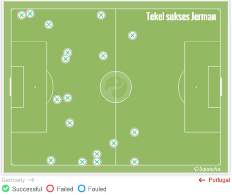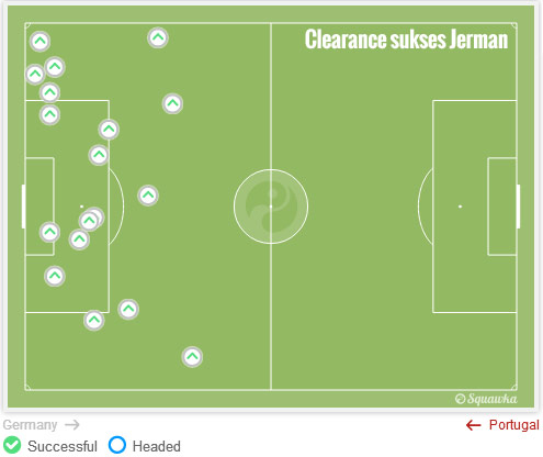 Alhasil, para pemain Portugal jadi cenderung ingin secepat mungkin mengoper bola kepada Nani atau Ronaldo di kedua sayap. Ini terlalu mudah ditebak. Jerman berulang kali sukses menetralisirnya dengan tekel, interception maupun clearance. Lihat statistik Squawka di bawah ini.