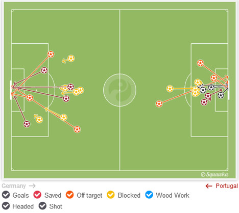 Portugal dan Jerman sama-sama menghasilkan total 13 shots dari ball possession yang nyaris berimbang (57% - 43%). Namun, karena Portugal kesulitan mendobrak skema pertahanan berlapis Jerman menyusul minimnnya variasi serangan, mereka pun lebih banyak menembak dari luar kotak. Kerja Neuer pun praktis jadi jauh lebih mudah.
