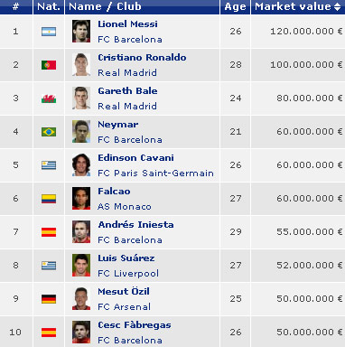 (Top 10 market value per 29 Januari 2014 © Transfermarkt)