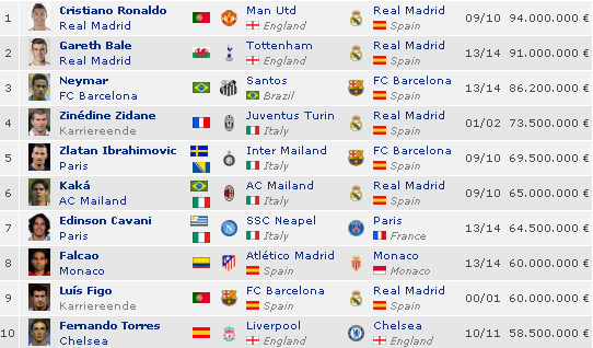 (Top 10 rekor transfer per 29 Januari 2014 © Transfermarkt)