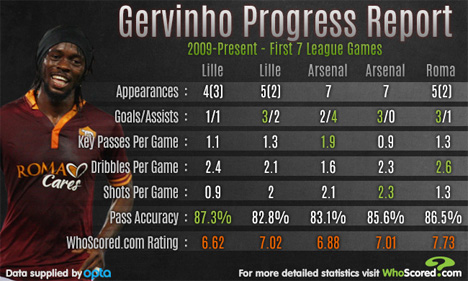 Dengan 3 gol dan 1 assist sejauh ini, kontribusi yang diberikan Gervinho kepada Roma sungguh positif. Saat Giallorrossi menumbangkan Inter 3-0 di giornata 7, Gervinho menegaskan bahwa dia belum habis. Gervinho memberi ancaman konstan dari sayap kanan dan menghasilkan 2 shot, 1 on target, 1 key pass, 5 sucessful drible, serta merancang assist untuk gol pembuka Il Capitano Francesco Totti.