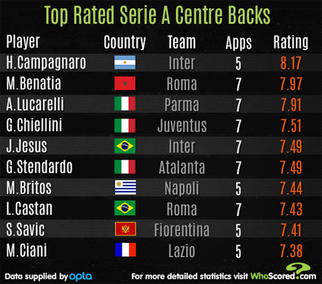 Sang capolista AS Roma tak diragukan memiliki pertahanan terbaik di Serie A sejauh ini dengan baru kebobolan satu gol. Namun, duet bek sentralnya (lagi-lagi) pemain luar, yaitu Leandro Castan (Brasil) dan Mehdi Benatia (Maroko).