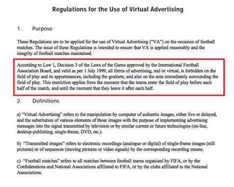 Dan jika dirunut pada aturan FIFA, cara 'ilegal' seperti itu sebetulnya tidaklah dibenarkan. Otoritas tertinggi sepakbola dunia itu sudah dengan tegas melarang penggunaan 'iklan virtual', apapun bentuknya, segera ketika tim memasuki lapangan hingga meninggalkan lapangan - terutama dalam kalender resmi macam Piala AFC U-19 kemarin.
