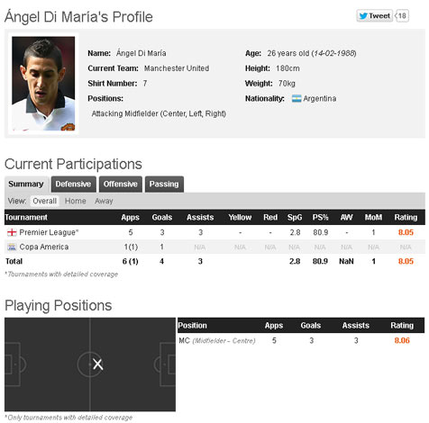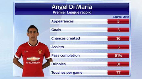 Tampil konsisten di lini serang Madrid, eks itu terus memberi ancaman untuk setiap lawan United dan praktis menjadi pemain terbaik United sejauh ini. Hal itu dipertegas dengan anugerah Pemain Terbaik Klub untuk bulan September kemarin. Namun tak lengkap rasanya menilai kontribusi Di Maria tanpa melihat rekam statistiknya - dan dari sinilah terlihat, bagaimana ia tampil begitu impresif sehingga pelatih Argentina, Gerardo Martino merasa United membayar cukup murah untuk servis kompatriotnya itu.