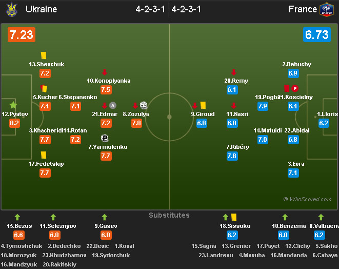(Ukraina membukukan rating 7,23 dan Prancis 6,73 © WhoScored)